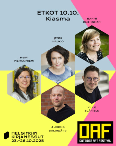 WSOY X Outsider Art Festival (OAF) esittää: Ulkopuolisuus kirjallisuuden kentällä –keskustelu ja OAF -kirjallisuusohjelman runostage. Yhdenvertaisuudesta taiteen toimijuudessa keskustelevat OAF:n toiminnanjohtaja Heini Merkkiniemi, kirjallisuusohjelman mentorit Sanni Purhonen ja Aleksis Salusjärvi sekä Helsingin Kirjamessujen ohjelmajohtaja Ville Blåfield. Moderaattorina WSOY:n yhteiskuntavastuun johtaja Jenni Haukio. Tekstejään esittävät OAF-kirjallisuusohjelman taiteilijat. Järjestäjinä WSOY ja OAF yhteistyössä Kiasman ja Helsingin Kirjamessujen kanssa.